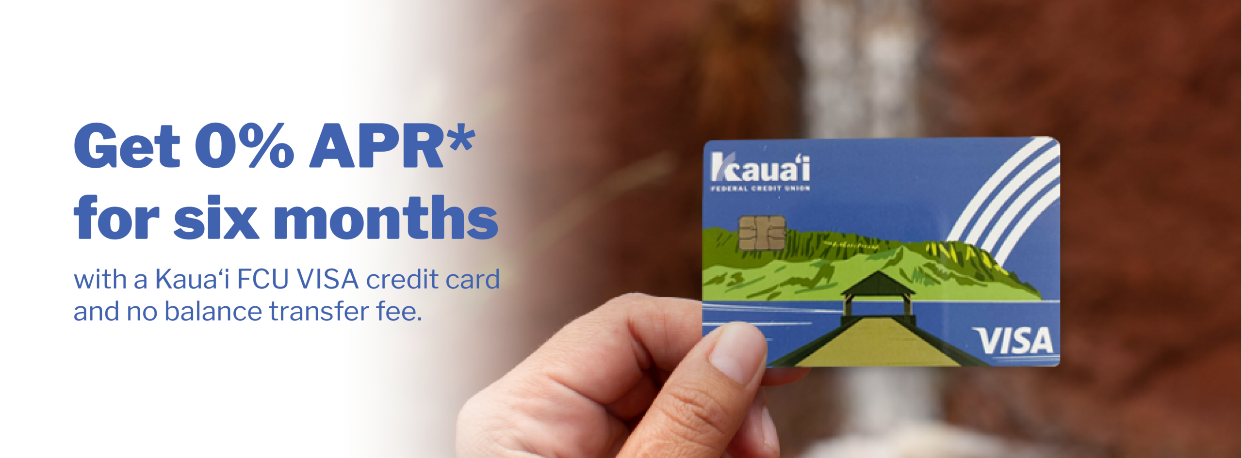 *APR = Annual Percentage Rate. The current Kaua‘i FCU Visa® Rewards credit card APR ranges from 9.99%–14.99%, based on creditworthiness. APR is fixed and will revert to the cardholder’s APR once the promotional rate concludes. 0.00% introductory APR applies to qualifying balance transfers posted between 02/01/26 and 02/28/26. The promotional APR will remain in effect for six months, after which the APR will revert to the cardholder’s standard fixed APR. No balance transfer fee applies to qualifying promotional balance transfers. Foreign transaction fee: 3%. No annual fee, no cash advance fee. Rates, terms, and conditions are subject to change. All credit is subject to approval.