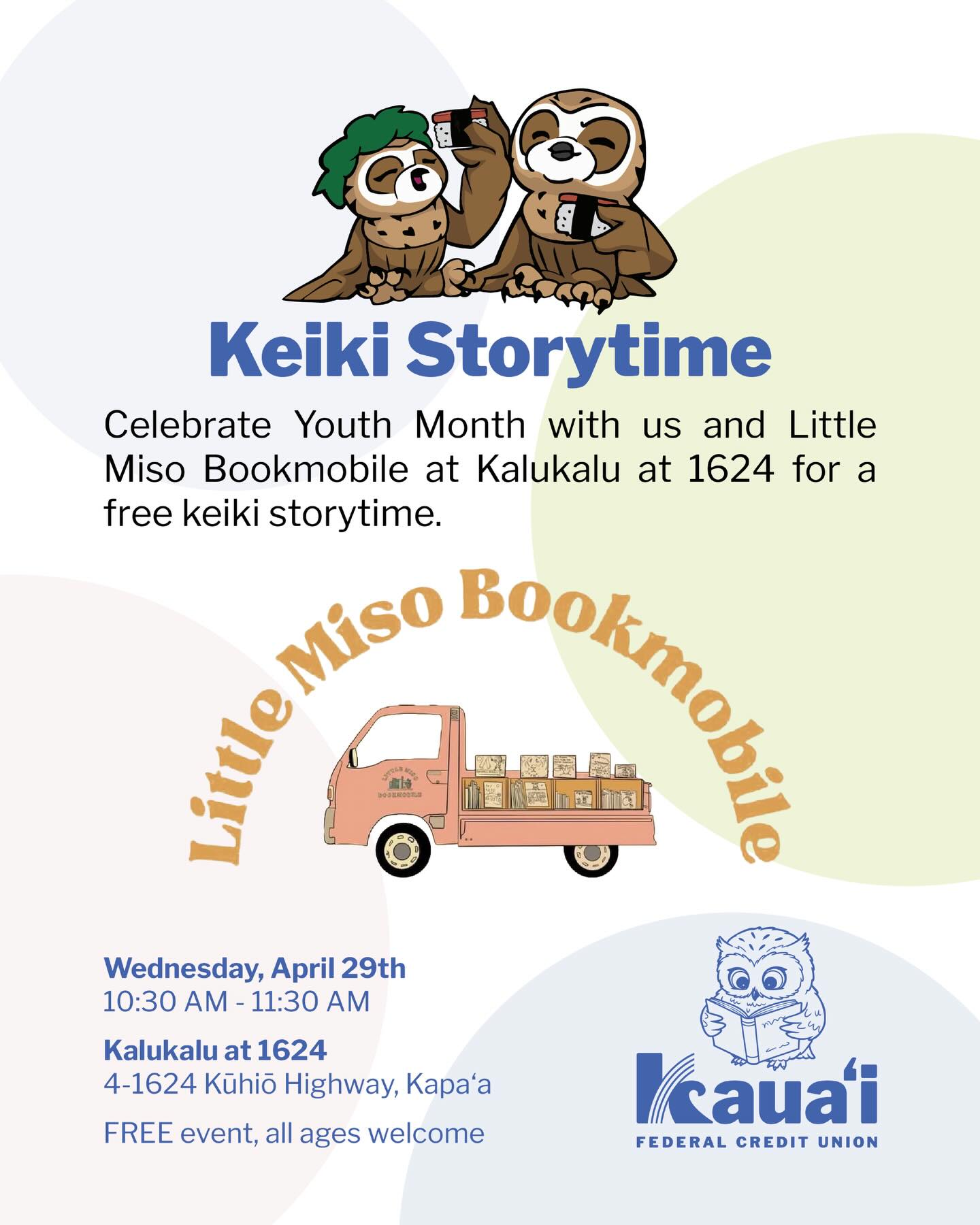 Event Title: Keiki Storytime with Little Miso Bookmobile Date & Time: Wednesday, April 29th · 10:30 AM – 11:30 AM Location: Kalukalu at 1624 · 4-1624 Kūhiō Highway, Kapaʻa Description: Celebrate Youth Month with Kauaʻi Federal Credit Union and Little Miso Bookmobile! Join us at Kalukalu at 1624 for a free keiki storytime — perfect... View Article